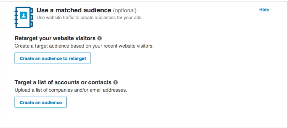LinkedIn has a ton of options for sponsored content (paid promotions). The newest option is Matched Audiences. You can target people who have visited your website, also called retargeting. Or you can target a list of ideal accounts or contacts, often called account based marketing, or ABM. (Read Doug Kessler’s account of how to integrate content marketing with account based marketing.)