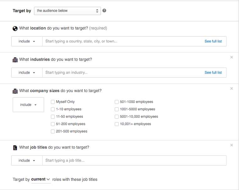 To reach new audiences who may not be on your radar, LinkedIn has a variety of targeting parameters to make your paid content distribution successful. You can geo-target, zero in on a particular industry (such as insurance, apparel & fashion, or manufacturing to name a few), exclude or include companies by their size, and even target individuals with certain titles (such as CEOs, Project Managers, Marketing VPs, etc.). There is even an option to target individuals at certain companies.
